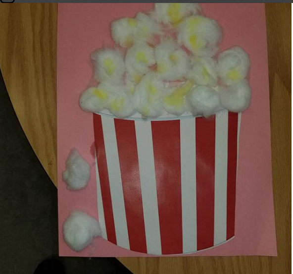 Another time we used water and food coloring to make paint and the kids loved the idea. We had a circus theme so we made popcorn with cotton, food coloring and water! Here’s a picture!