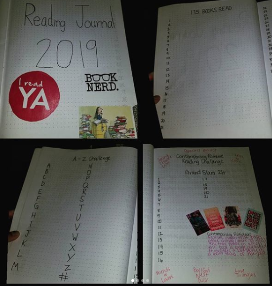 So, the first thing I put in my reading bullet journal is all the things I need for throughout the entire year. (That first pic is just my title page lol) The first one actually in my journal is the list of 175 books I read this year. I put 175 because that’s my Goodreads Challenge. I did not do the bookshelf thing because I can’t draw, and also trying to fit 175 books onto a bookshelf will make it like my real life one… Messy. So I decided against it. They look so pretty, but I think it’s more cleaner and more neater to just list them. Then I have my A-Z challenge and the Contemporary Romance Challenge. I had a bit of room on that page so I just added some cut-outs of some contemp romance books I am really excited for that are coming out soon.