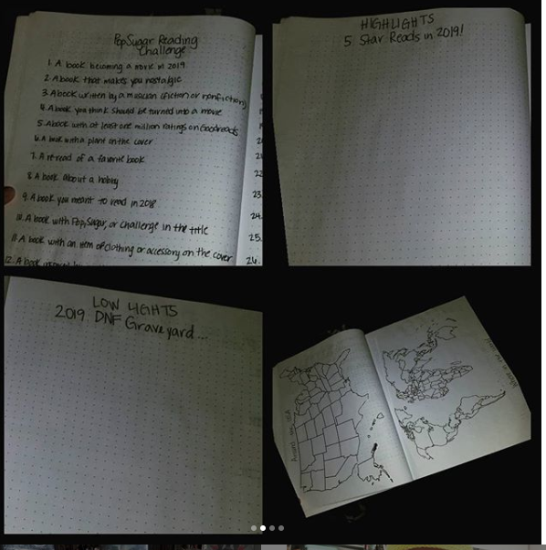 The next one is my Pop-Sugar Reading Challenge, the Highlights or 5 Star reads of 2019, the Low lights or DNFs of 2019, and the state and world map for tracking the places my reading takes me throughout 2019.