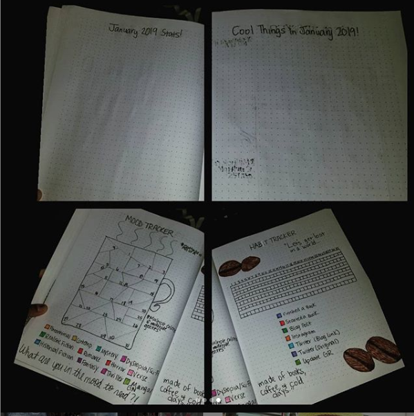 After that, I placed my stats (the title, the format, and the rating, etc), any cool bookish things that happened to me in that month (author signings, Work stuff, etc), a Mood Tracker, and a habit tracker. My husband told me to explan why I added a Mood Tracker and habit Tracker to this when I don’t use this as a lifestyle planner, so here goes. If you don’t know, I’m a mood reader. If I don’t feel like reading that certain genre, I will DNF with a quickness. I’m trying to get better about just reading what my mood says instead of DNFing so much, so I’ve been tracking my reading tastes. For my habit tracker, I’ve been looking at simple things like “Did I instagram today?””Did I finish or start a book?” etc. The spreads will vary by the month it is. For January I went with a coffee theme. And again, I can’t draw. I totes found the spread on Pinterest and then copied it to the best of my ability. It doesn’t look the best, but its ok for me lol