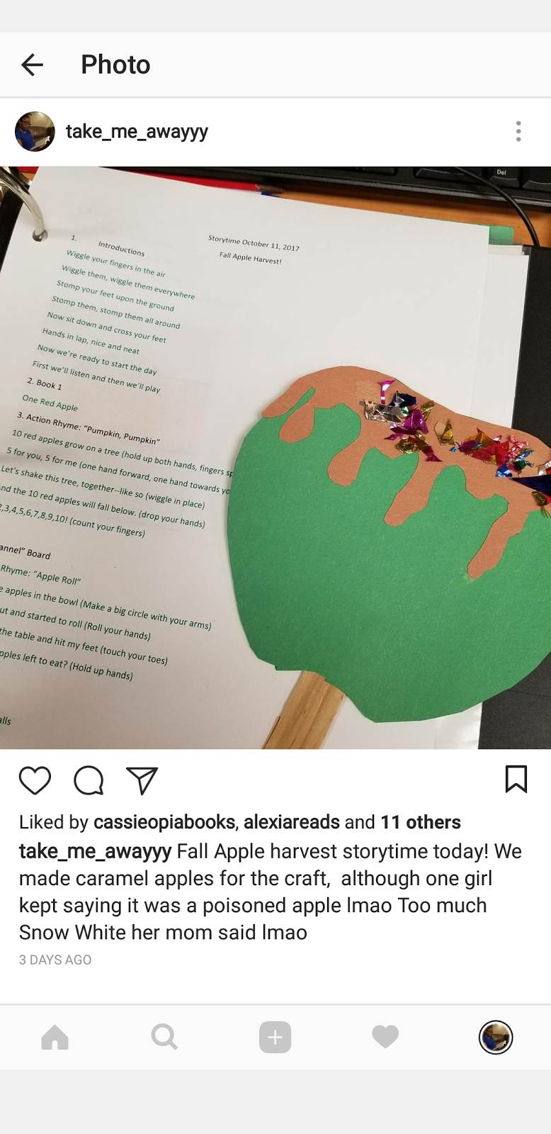 We did a Fall Apple Harvest storytime theme this past week and we made caramel apples for the craft. There was one girl who loves Disney princesses who kept saying “No caramel Mommy, ITS A POISON APPLE.” Can we guess which Disney princess is her favorite lmaooooo