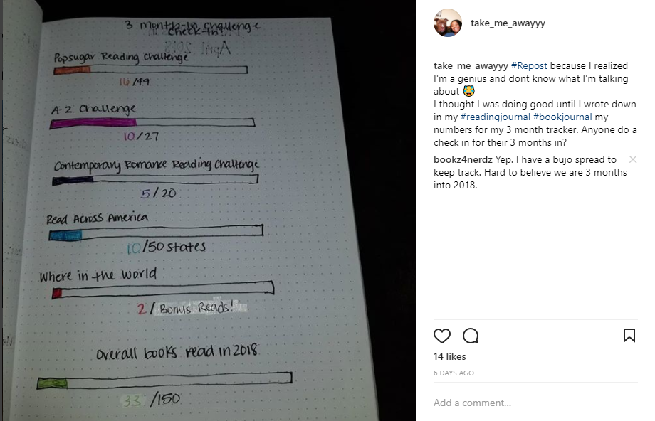I did a three month check in for my challenges in my bookish bullet journal. It’s ugly from all the white out, but ehhh it works for me lol