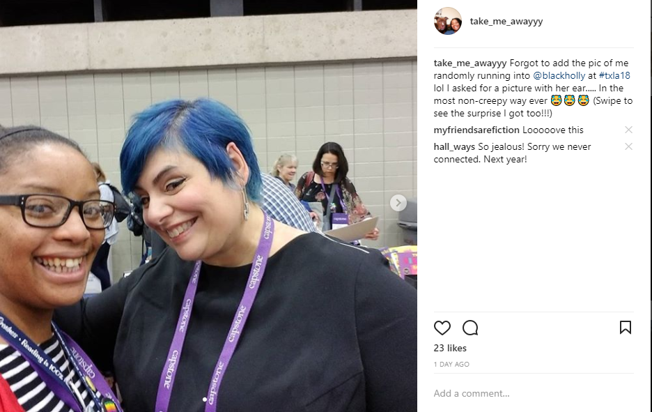 I ran into Holly Black in a booth after I came back to the exhbit hall after a session! It was super random and really awesome. I was able to score a COOL picture with her ear too!