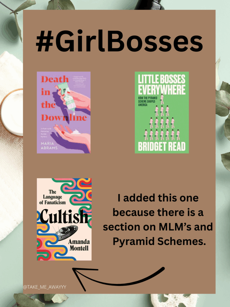 This connection was hilarious. These pyramid schemes are no joke. And in both of these, they show it. And they both show them so realistically. This one featured the main character actually joining them. And what a bad idea this was lol In this story the MLM*** is a big part of the plot once Emerson says yes. She quickly learns what this thing REALLY is and begrudgingly realizes that someone who told her it was “culty” wasn’t lying. I was proud of her for realizing what was really going on and getting out when she could. Because Lordt, I don’t think I would have been as calm as she was during that whole ordeal lol